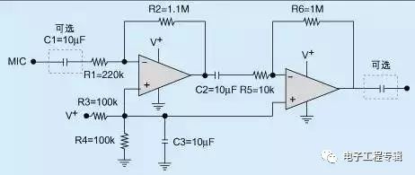 請(qǐng)注意,這款電路只適用于單電源供電的設(shè)計(jì),其中輸入及輸出電容器(C1及C4)只是選項(xiàng),工程師可根據(jù)實(shí)際情況考慮選用。適用與否取決于用戶系統(tǒng)的輸入與輸出如何連接。若麥克風(fēng)輸出設(shè)有直流補(bǔ)償,那么便需要增設(shè)C1輸入電容器,以便阻塞直流電信號(hào)。輸出電容器也可發(fā)揮相同的作用。 目前市場(chǎng)上出售的麥克風(fēng)大部分以2k(左右的高阻抗麥克風(fēng)以及只有幾百(的低阻抗麥克風(fēng)為主,這兩類麥克風(fēng)都可采用上述前置放大器設(shè)計(jì)。高阻抗高輸出麥克風(fēng)前置放大器較為簡(jiǎn)單,可以采用非反相或反相放大器配置。由于其頻率響應(yīng)較為平坦,因此無(wú)需特別加以均衡,而且輸入電平較大,放大器對(duì)噪聲的要求很低,但高阻抗麥克風(fēng)對(duì)來(lái)歷不明的噪聲及磁場(chǎng)極為敏感。低阻抗低輸出麥克風(fēng)前置放大器也可采用非反相或反相放大器將輸入信號(hào)放大,頻率響應(yīng)及均衡等方面的要求都與高阻抗高輸出的前置放大器大致相同。如果麥克風(fēng)的輸出電平較低,工程師必須注意選用低噪聲的運(yùn)算放大器。如性能較好的低噪聲運(yùn)算放大器應(yīng)該產(chǎn)生較低的輸入?yún)⒄针妷涸肼?,而且噪聲不?yīng)超過(guò)10nV/((Hz)。