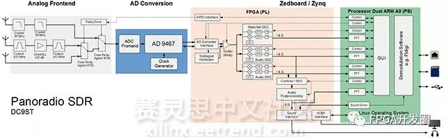 Panoradio是一款基于Zedboard和AD9467 ADC器件的SDR設備,具有最大250MHz的采樣帶寬,0—100MHZ還支持信號直接采樣接收,該設備移植了Linux嵌入式操作系統(tǒng),提供了全面的解調(diào)軟件事例。此外Panoradio是一項開源工程,相關設計資料提供下載(下載地址)。