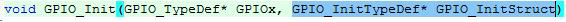void GPIO_Init(GPIO_TypeDef* GPIOx, GPIO_InitTypeDef* GPIO_InitStruct);