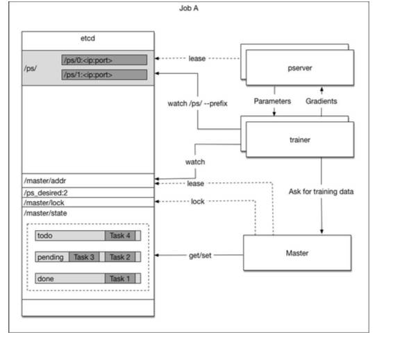 PaddlePaddle用etcd來(lái)記錄訓(xùn)練進(jìn)程的狀態(tài)。etcd是高可靠性的分布式key-value存儲(chǔ),訓(xùn)練進(jìn)程會(huì)定時(shí)把自身狀態(tài)寫進(jìn)etcd,而這些信息將會(huì)在必要的時(shí)候用來(lái)恢復(fù)訓(xùn)練進(jìn)程。具體過(guò)程如下圖: