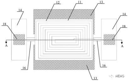扭轉(zhuǎn)式微機(jī)械磁場傳感器的俯視結(jié)構(gòu)示意圖本發(fā)明的扭轉(zhuǎn)式微機(jī)械磁場傳感器主要包括諧振結(jié)構(gòu)組件。該諧振結(jié)構(gòu)組件包括:諧振結(jié)構(gòu)、第一絕緣層、感應(yīng)線圈及驅(qū)動電極。其中,第一絕緣層位于諧振結(jié)構(gòu)表面;感應(yīng)線圈位于第一絕緣層表面;驅(qū)動電極適于以靜電驅(qū)動方式驅(qū)動諧振結(jié)構(gòu),使得諧振結(jié)構(gòu)工作時處于扭轉(zhuǎn)諧振模態(tài)。本發(fā)明的扭轉(zhuǎn)式微機(jī)械磁場傳感器由于采用靜電驅(qū)動方式工作,器件的功耗幾乎為零,不存在功耗過大而導(dǎo)致的器件溫度穩(wěn)定性問題;由電磁感應(yīng)定律可知,本發(fā)明的扭轉(zhuǎn)式微機(jī)械磁場傳感器在大范圍的磁場測量中都具有極佳的線性度。