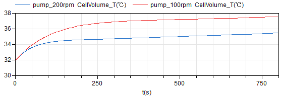 電池電機供電、電機驅(qū)動負(fù)載,電池產(chǎn)生的熱量通過液冷循環(huán)與空調(diào)系統(tǒng)之間的換熱器實現(xiàn)冷卻液與制冷劑之間的熱量交換,然后通過空調(diào)系統(tǒng)傳到發(fā)動機艙,最后熱量被空氣帶走。圖 5為不同泵的轉(zhuǎn)速下電池包溫度變化曲線。改變冷卻循環(huán)中泵的轉(zhuǎn)速可以將流過電池包的冷卻液溫度保持在所需要的溫度范圍。