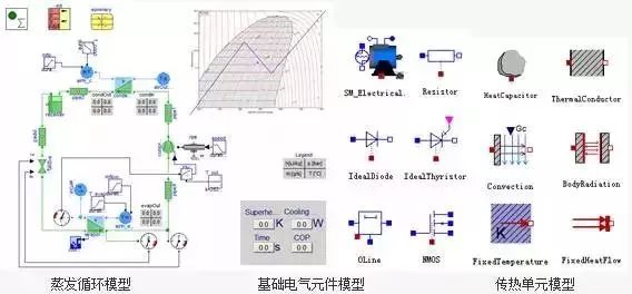 Dymola軟件具有豐富的模型庫,采用基礎(chǔ)庫與商業(yè)庫可以方便的搭建電池?zé)峁芾硐到y(tǒng)。蒸發(fā)循環(huán)庫涵蓋了市面上幾乎所有主流的制冷劑,有著精確的兩相流模型和根據(jù)結(jié)構(gòu)建模的換熱器模型;考慮元件生熱和溫度對元件電氣性能影響的電阻、二極管、晶閘管、電機等基礎(chǔ)元件模型;具有熱容、熱傳導(dǎo)、對流、輻射、溫度、熱流邊界條件等的傳熱元件模型。