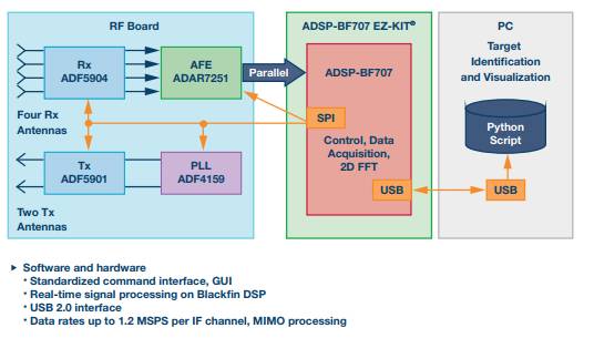 該系統(tǒng)硬件解決方案包括射頻天線和一條完整的射頻到基帶信號(hào)鏈(ADF5904(接收)、ADF5901(發(fā)射),ADF4159 (PLL),ADAR7251 (AFE)),其中還包括ADI的ADSP-BF707 DSP(數(shù)字信號(hào)處理器),可通過(guò)易用的圖形用戶界面和雷達(dá)算法軟件快速連接筆記本電腦/PC(圖2)。