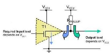 (4)可以利用改變上拉電源的電壓,改變傳輸電平:圖表 5 open-drain輸出電平的原理,IC的邏輯電平由電源Vcc1決定,而輸出高電平則由Vcc2決定。這樣我們就可以用低電平邏輯控制輸出高電平邏輯了。