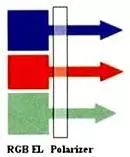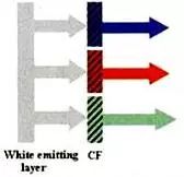 此種技術(shù)是利用白光OLED結(jié)合彩色濾光膜,首先制備發(fā)白光OLED的器件,然后通過彩色濾光膜得到三基色,再組合三基色實現(xiàn)彩色顯示。