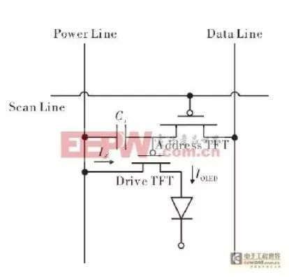 對于OLED驅(qū)動控制系統(tǒng)的實現(xiàn),關(guān)鍵技術(shù)在于數(shù)據(jù)的寫入和掃描控制,如上圖所示為單個像素的雙管驅(qū)動電路。一個TFT用來尋址,另一個是電流調(diào)制晶體管,用來為OLED提供電流。為防止OLED開啟電壓的變化導(dǎo)致電流變化,使用的是P溝器件,這樣OLED處于驅(qū)動TFT的漏端,源電壓與有機層上的電壓無關(guān)。Data Line 與尋址TFT的源級相連,ScanLine使地址TFT選通,數(shù)據(jù)線上的內(nèi)容通過漏級寫入到存儲電容CS上,并以電荷的形式暫存。當(dāng)Power Line為高電平時,驅(qū)動TFT的源級為高電平,同時CS上的電荷將選通驅(qū)動TFT,其漏電流流過OLED顯示器件,驅(qū)動其發(fā)光。數(shù)據(jù)線電平的高低決定了像素的亮暗。