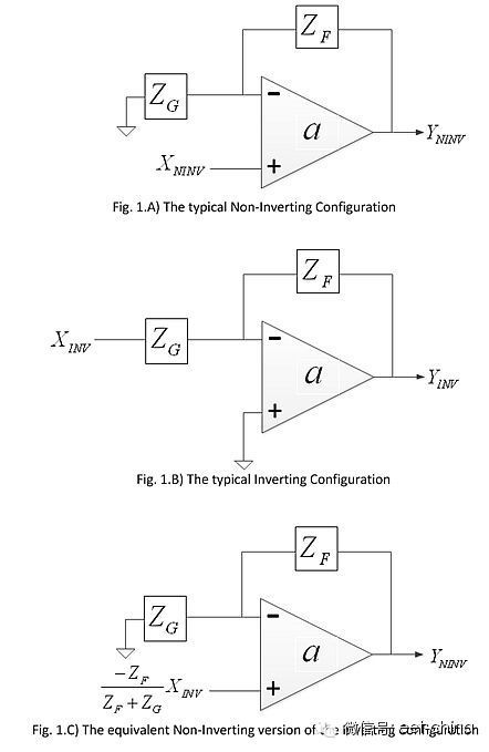 圖1A:典型的同相配置。圖1B:典型的反相配置。圖1C:反相配置的等效同相版本。為了方便理解兩種配置的前饋增益之間的區(qū)別,這里給出了分別對應(yīng)同相和反相配置的公式1.a和1.b。有人可能會問,為什么反相配置(AINV)的前饋增益不同于同相配置(ANINV),而事實上兩種配置使用的是相同的運放。