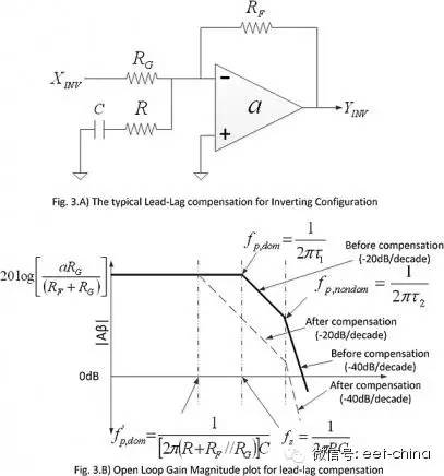 圖2A:同相配置框圖。圖2B:反相配置框圖。圖2C:針對反相配置的重配置框圖。噪聲增益:不僅僅針對噪聲為了方便理解,輸出噪聲(包括偏移量)通常以運放或放大器的輸入端為參考。一般來說,給定極性的輸出電壓完全以運放正輸入端為參考會導(dǎo)致輸入電壓與輸出電壓有相同的極性,而完全以負(fù)輸入端為參考會導(dǎo)致相反極性的輸入電壓。從非相關(guān)噪聲模型角度看,噪聲電壓的符號或相位是不相關(guān)的,因此噪聲電壓的參考是運放的反相還是同相輸入端在數(shù)學(xué)上都是等效的。由于反相輸入端有反饋網(wǎng)絡(luò),因此輸出噪聲完全以運放的同相輸入端為參考能夠很快得出同相放大器的有效且可識別的配置(圖1A)。這樣,以運放任一輸入端為參考的噪聲總體增益總是等于反相配置的閉環(huán)增益。因此,即使采用了相對于信號源的反相配置,但以運放輸入端為參考的噪聲實際上只看到等于(1+ZF/ZG)的同相配置增益,一般稱之為噪聲增益(NG)。然而,如果噪聲源連接的是運放的正輸入端,就像同相配置中那樣,那么信號增益以及以輸入為參考的噪聲就完全等于噪聲增益。補(bǔ)償技術(shù):目的運放補(bǔ)償技術(shù)有很多種,如“主極點補(bǔ)償”,“增益補(bǔ)償”,“超前補(bǔ)償”,“補(bǔ)償衰減器”以及“超前-滯后補(bǔ)償”。任何補(bǔ)償技術(shù)的理想結(jié)果都是從純穩(wěn)定性角度使多極點系統(tǒng)(高階系統(tǒng))接近單極點整體系統(tǒng),因為單極點反饋系統(tǒng)是無條件穩(wěn)定的。大多數(shù)補(bǔ)償技術(shù)至少能實現(xiàn)有效的雙極點系統(tǒng)狀態(tài),其中第二個極點(第一個非主要極點)盡可能遠(yuǎn)離第一個極點(主要極點),并且通常具有較高的頻率拐點,而且拐點相對遠(yuǎn),對穩(wěn)定性的影響可以忽略不計。在一些情況下,通過有意減小主要極點和非主要極點之間的距離來增強(qiáng)帶寬,這時通過增益頻率響應(yīng)可以觀察到一些高頻峰值。在許多電子技術(shù)文獻(xiàn)中,所有補(bǔ)償技術(shù)中解釋最不好的也許是超前-滯后補(bǔ)償技術(shù)了。遺憾的是,某些流行的參考文獻(xiàn)在開環(huán)增益曲線以及對超前-滯后補(bǔ)償?shù)南嚓P(guān)描述中存在錯誤,因此本文將重點討論這方面內(nèi)容。超前網(wǎng)絡(luò)的嚴(yán)格定義或至少清晰的定義是,它的零點頻率幅值比極點的要低,因此催生出純粹兩個拐點。在滯后網(wǎng)絡(luò)中則相反,極點頻率幅值比零點的低。超前-滯后網(wǎng)絡(luò)是這兩種網(wǎng)絡(luò)的組合,超前網(wǎng)絡(luò)的全部兩個拐點頻率的頻率幅值都要小于滯后網(wǎng)絡(luò)的頻率幅值。同樣,在滯后-超前網(wǎng)絡(luò)中,滯后網(wǎng)絡(luò)的兩個拐點的頻率幅值要小于超前網(wǎng)絡(luò)。不管是滯后-超前網(wǎng)絡(luò)還是超前-滯后網(wǎng)絡(luò),每種網(wǎng)絡(luò)都會形成4個拐點:兩個極點和兩個零點。在給定總體系統(tǒng)與技術(shù)約束條件下,人們也許會使用任何合適的補(bǔ)償網(wǎng)絡(luò)去補(bǔ)償具有與生俱來且有時不可修改拐點的系統(tǒng)。所選的補(bǔ)償技術(shù)可能專門用引入的零點去抵消固有的系統(tǒng)極點,反之亦然,從而得到一個純粹更低階的系統(tǒng)。本文采用開環(huán)增益表達(dá)式的Bode圖用于穩(wěn)定性分析,并得出極點和零點的定義。超前-滯后補(bǔ)償:實現(xiàn)根據(jù)參考文獻(xiàn)給出的超前-滯后補(bǔ)償電路如圖3A所示。出于實用和簡單的目的,假設(shè)未補(bǔ)償運放有兩個固有極點:主極點(?p,dom)和第一個非主要極點(?p,nondom)。圖3B顯示了開環(huán)增益幅度圖,其中實線代表未補(bǔ)償運放的情況,顯示出了運放本身的固有拐點。