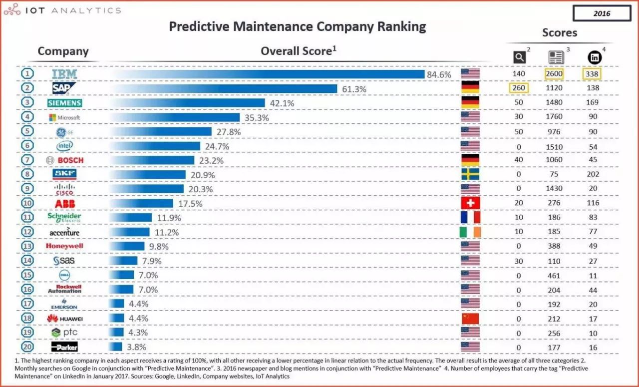 IOT Analytical發(fā)布的2016年全球物聯(lián)網(wǎng)企業(yè)前20強(qiáng)名單來看,大部分企業(yè)都是美國的企業(yè),這與美國作為世界互聯(lián)網(wǎng)技術(shù)中心的地位有關(guān)。而德國的SAP和西門子兩家企業(yè)位居第二第三,這與德國近幾年將“工業(yè)4.0”作為國家戰(zhàn)略目標(biāo)密不可分。在前20強(qiáng)中只有一家中國企業(yè),即華為。