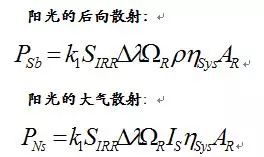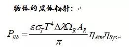 上式中,ε是目標的輻射系數(shù);ρ是目標的反射系數(shù);T是目標的溫度(K);Δλ是光波長范圍(μm);AR是接收機探測器敏感面面積(m2);k1是太陽光通過大氣的透過系數(shù);SIRR是太陽的輻射度(是大氣的散射系數(shù);ηSys是系統(tǒng)的光學(xué)效率;ΩR是輻射體輻射的能量的立體角;σT是斯特藩-玻耳茲曼常數(shù)。