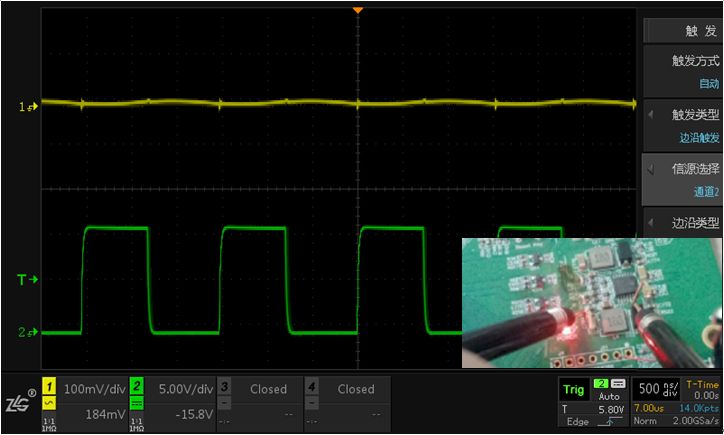 圖3 CH1使用夾子測量電源輸出,CH2使用夾子測量電感,單點(diǎn)接地