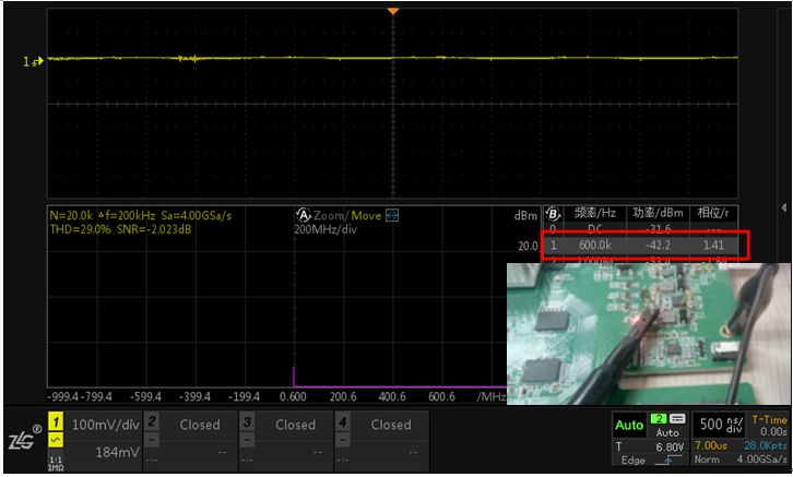 注:通道1信號幅度雖然非常小,但通過FFT分析還是可以定位出600K頻點(diǎn)的干擾。