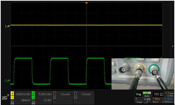 1、通道1探頭地使用鱷魚夾接地,通道2關(guān)閉(證明通道1信號原狀,見圖2)