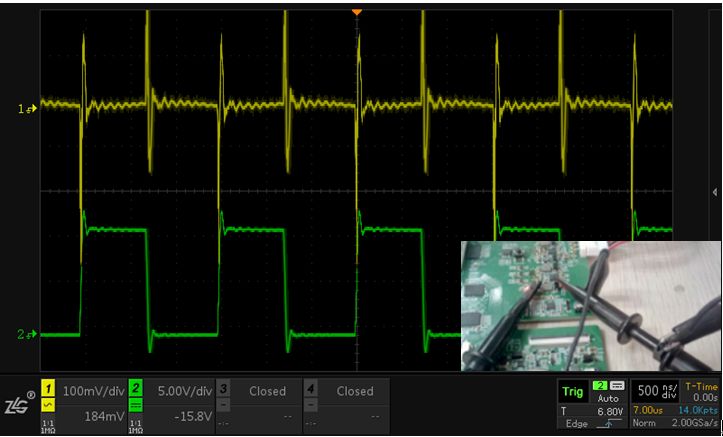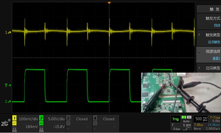 測試原理:通道1測量小信號(100mv/div),通道2測量大信號(5V/div),觀察信號互相影響的情況。