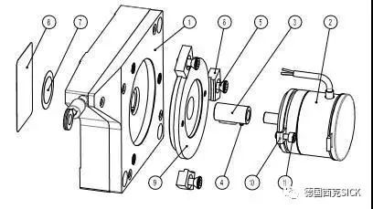 2) 如果是外徑為36的編碼器則需要通過轉(zhuǎn)換法蘭(圖中9)來安裝在拉線機(jī)構(gòu)上,仍然需要特殊的軸套(圖中3)來套在編碼器(圖中2)的軸上,再通過螺栓將編碼器固定在拉線機(jī)構(gòu)上(圖中1)。