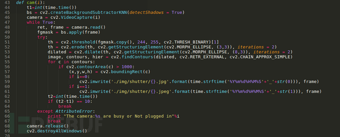 這個函數(shù)的主要功能就是圖像的運動檢測,當(dāng)有運動物體時,便會將圖片以“%Y%m%d%H%M%S’+’_’+str(0)”的格式記錄下來,有時候可能存在兩個攝像頭同時工作記錄,導(dǎo)致記錄下來的圖片日期一樣,為了避免這個Error產(chǎn)生,在日期的后面加上了攝像頭“i”的標(biāo)識,用來進(jìn)行分辨!