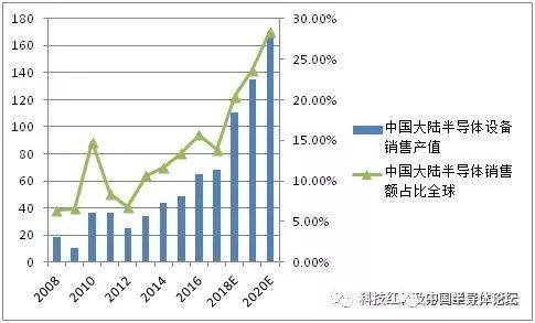 2008-2014年,中國(guó)大陸半導(dǎo)體設(shè)備銷(xiāo)售產(chǎn)值大約在20-40億美金之間,占比全球份額比例不足5%,中國(guó)大陸半導(dǎo)體集成電路領(lǐng)域的“第二次大投入”將驅(qū)動(dòng)中國(guó)半導(dǎo)體設(shè)備領(lǐng)域份額從5%提升到25%以上。驅(qū)使中國(guó)大陸半導(dǎo)體設(shè)備銷(xiāo)售產(chǎn)值從40億美金快速提升到2018年的100億美金以上,我們預(yù)計(jì)2020年左右,中國(guó)大陸半導(dǎo)體設(shè)備銷(xiāo)售產(chǎn)值預(yù)計(jì)占比全球份額比例超過(guò)25%以上。