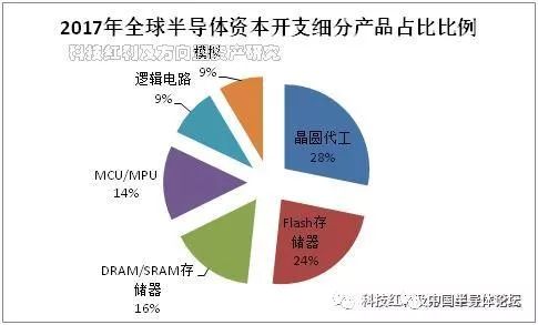 2017年存儲(chǔ)器領(lǐng)域的資本開(kāi)支(CAPEX)占比比例將近40%,超過(guò)晶圓代工,躍升為半導(dǎo)體集成電路資本開(kāi)支第一大細(xì)分領(lǐng)域。其中NORFLASH/NAND FLASH存儲(chǔ)器芯片占比比例24%,DRAM/SRAM存儲(chǔ)器占比比例16%。
