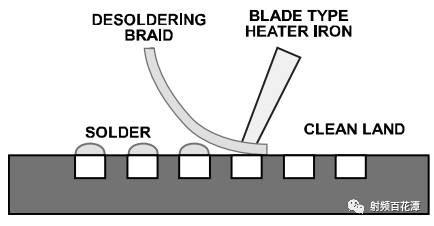 1. 去錫。利用吸錫線和刀片型烙鐵去除焊盤上過多的焊料(參見圖6)。所選刀片的寬度應(yīng)與器件占用的最大寬度相匹配。刀片溫度必須足夠低,以避免損壞電路板??蓪⒑竸┩吭诤副P上,然后用吸錫線和烙鐵去除過多焊料。