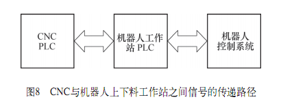 CNC與機(jī)器人上下料工作站PLC之間信號(hào)的傳遞路徑如圖8所示。CNC機(jī)床PLC與上下料工作站PLC之間進(jìn)行信息交換,機(jī)器人控制系統(tǒng)與上下料工作站PLC之間進(jìn)行信息交換。