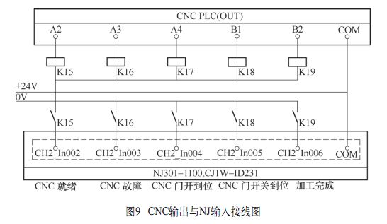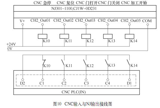 CNC機(jī)床PLC的輸出接口為源型輸出,而NJ PLC的輸入接口必須接為漏型,所以CNC機(jī)床PLC的輸出信號(hào)通過中間繼電器進(jìn)行過渡。CNC輸出與NJ輸入接線圖如圖9所示。CNC輸入與NJ輸出接線圖如圖10所示。