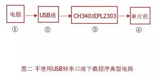 請看圖二,這是我經(jīng)常采用的單片機(jī)下載電路。實(shí)踐證明效果非常好,幾乎沒出過任何問題!它的好處是只需要找根普通的USB2.0線(如圖二中②)就可以下載了,比找根USB轉(zhuǎn)串口線要輕松的多,同時由于將串口9針接口換成了USB接口,所以電路板的體積、重量也減少了不少,也顯得更美觀時尚,呵呵。在此強(qiáng)調(diào)一點(diǎn):推薦使用CH340芯片(可以用CH340G,它引腳間距大很容易焊接)而不是PL2303,上文已說PL2303水貨多,況且PL2303的外圍電路比較復(fù)雜,這也給硬件電路的調(diào)試增加了難度。當(dāng)然如果項(xiàng)目對成本特敏感,那么采用價錢相對較低的PL2303也無可厚非。大家看到?jīng)],圖二的電路結(jié)構(gòu)比圖一要簡化很多,那么是不是可以說明圖二的性能比圖一要更好呢?應(yīng)該是吧!簡單的結(jié)構(gòu)出問題的概率當(dāng)然更小了!