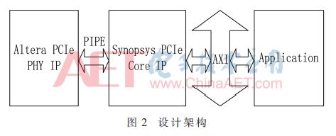 本設(shè)計(jì)采用的整體架構(gòu)如圖2所示,為Altera PHY IP+Synopsys PCIe Core IP+AXI總線+Application。