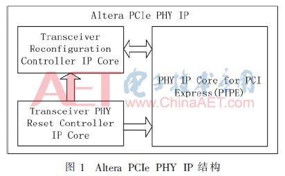 本設(shè)計(jì)使用Stratix V GX系列下的5SGXEA7K2F40C2N FPGA芯片,該芯片內(nèi)部集成了PCIe PHY IP硬核模塊。PCIe PHY IP硬核包括三個(gè)部分,如圖1,PHY IP Core for PCI Express(PIPE)集成了PCIe總線的物理層。Transceiver Reconfiguration Controller IP Core可以動(dòng)態(tài)重新配置模擬參數(shù)。Transceiver PHY Reset Controller IP Core作為收發(fā)器的復(fù)位模塊,確保了PCIe鏈路的初始化。
