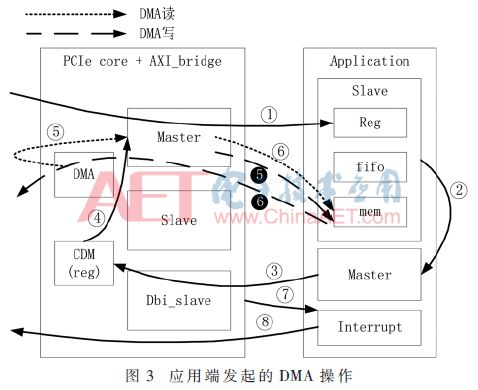 應(yīng)用端發(fā)起的DMA操作流程如圖3所示,最終DMA讀操作實(shí)現(xiàn)的結(jié)果為將主機(jī)側(cè)的數(shù)據(jù)以DMA的方式寫入到應(yīng)用端的內(nèi)存中。DMA寫操作實(shí)現(xiàn)的結(jié)果為將應(yīng)用端的數(shù)據(jù)以DMA的方式寫入到主機(jī)側(cè)的內(nèi)存中。圖3為應(yīng)用端發(fā)起的DMA操作具體的流程。