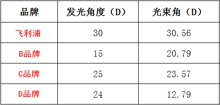 在光束角方面,飛利浦樣品光束角最大,實際照明效果表現(xiàn)為光斑最大,散射范圍最廣;D品牌光束角最小,光斑最小,中心光強也最大。
