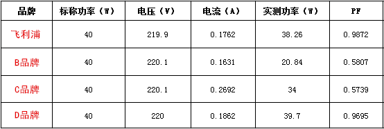 眾所周知,功率因數(shù)是衡量電氣設(shè)備效率高低的一個系數(shù)。功率因數(shù)低,說明電路用于交變磁場轉(zhuǎn)換的無功功率大,從而降低了設(shè)備的利用率。B品牌和C品牌在功率因素值較小,由電能轉(zhuǎn)換成光能效率較低,產(chǎn)生的無效功率(例如熱量)較高。
