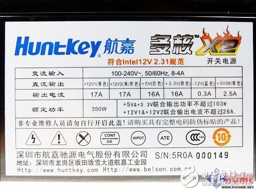 在電源的表面,80PLUS認(rèn)證標(biāo)識(shí)、ATX 12V 2.31認(rèn)證規(guī)范標(biāo)識(shí)以及防偽標(biāo)識(shí)十分扎眼,顯示了這款多核X2的出色品質(zhì)。