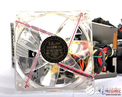 航嘉 多核X2電源所使用的散熱風(fēng)扇是悅倫 智能溫控LED彩燈透明大風(fēng)扇,采用12V、0.30A的供電設(shè)計(jì)。風(fēng)扇運(yùn)行時(shí),四角邊上的LED燈會(huì)亮起并呈現(xiàn)出四種不同的顏色,使電源呈現(xiàn)出特別的個(gè)性。