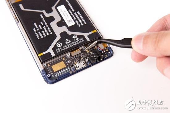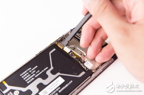 我們發(fā)現(xiàn)電池表面設(shè)計(jì)有四個(gè)大面積的提手,所以將它們提起嘗試分離電池,但電池紋絲不動(dòng),固定的非常牢固。最終我們發(fā)現(xiàn)還是電池底部的那片提手最容易提出,并最終將電池分離??傮w來講更換電池的難度還是要比純采用強(qiáng)力雙面膠固定的機(jī)型要容易的。