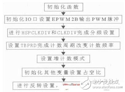 PWM是利用微處理器的數(shù)字輸出來對(duì)模擬電路進(jìn)行控制的一種非常有效的技術(shù),廣泛應(yīng)用在從測(cè)量、通信到功率控制與變換的許多領(lǐng)域中。本系統(tǒng)采用DSP產(chǎn)生脈沖序列,DSP28335共12路16位的ePWM,能進(jìn)行頻率和占空比控制。PWM信號(hào)頻率由時(shí)基周期寄存器TBPDR和時(shí)基計(jì)數(shù)器的計(jì)數(shù)模式?jīng)Q定。初始化程序采用的計(jì)數(shù)模式為遞增計(jì)數(shù)模式。在遞增計(jì)數(shù)模式下,時(shí)基計(jì)數(shù)器從零開始增加,直到達(dá)到周期寄存器值(TBPDR),然后時(shí)基計(jì)數(shù)器復(fù)位到零,再次開始增加。