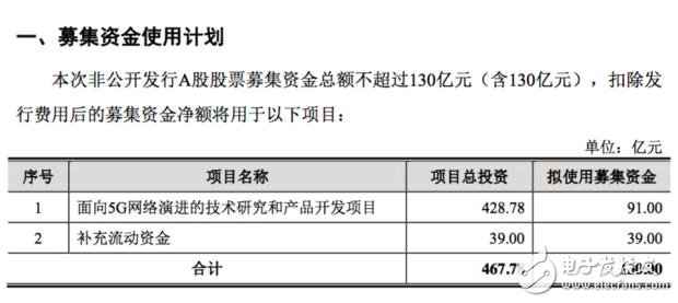 根據(jù)議案,本次募集資金主要用于投入中興通訊“面向5G網(wǎng)絡(luò)演進(jìn)的技術(shù)研究和產(chǎn)品開(kāi)發(fā)項(xiàng)目”,包括蜂窩移動(dòng)通訊網(wǎng)絡(luò)技術(shù)研究和產(chǎn)品開(kāi)發(fā)、核心網(wǎng)技術(shù)研究和產(chǎn)品開(kāi)發(fā)、傳輸與承載網(wǎng)技術(shù)研究和產(chǎn)品開(kāi)發(fā)、固網(wǎng)寬帶技術(shù)研究和產(chǎn)品開(kāi)發(fā)、大數(shù)據(jù)與網(wǎng)絡(luò)智能技術(shù)研究和產(chǎn)品開(kāi)發(fā)。該項(xiàng)目計(jì)劃總投資428.78億元,擬使用募集資金91億元。另外39億元用于補(bǔ)充流動(dòng)資金。