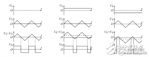 當(dāng)指令信號(hào)UI=0時(shí),輸出信號(hào)Us為正負(fù)脈沖寬度相等的矩形脈沖。當(dāng)UI》0時(shí),Us的正脈寬大于負(fù)脈寬。當(dāng)UI《0時(shí),Us的正脈寬小于負(fù)脈寬。當(dāng)UI》UTPP/2時(shí)(UTPP是三角波的峰值),Us為一正直流信號(hào);當(dāng)UI《UTPP/2時(shí),Us為一負(fù)直流信號(hào)。