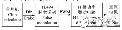 由圖3可以看出,首先由單片機(jī)發(fā)出電機(jī)邏輯控制信號(hào),主要包括電機(jī)運(yùn)轉(zhuǎn)方向信號(hào)Dir,電機(jī)調(diào)速信號(hào)PWM及電機(jī)制動(dòng)信號(hào)Brake,然后由TL494進(jìn)行脈寬調(diào)制,其輸出信號(hào)驅(qū)動(dòng)H橋功率電路來(lái)驅(qū)動(dòng)直流電機(jī)。其中H橋是由4個(gè)大功率增強(qiáng)型場(chǎng)效應(yīng)管構(gòu)成的,其作用是改變電機(jī)的轉(zhuǎn)向,并對(duì)驅(qū)動(dòng)信號(hào)進(jìn)行放大。