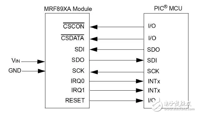 圖 1:?jiǎn)纹瑱C(jī)與MRF89XA模塊之間的接口;無(wú)線和RF節(jié)點(diǎn)圖
