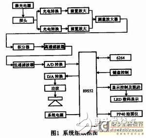 系統(tǒng)組成框圖如圖1所示。系統(tǒng)工作時,從激光探頭發(fā)射出一束激光照射到組織上,并穿透組織形成一個半徑為1mm的半球,半球中心在探頭處。所有穿過該區(qū)域的血細(xì)胞會反射回部分光線,造成光線的多普勒移動,移動的強度和頻率與穿過該區(qū)域的血細(xì)胞數(shù)量和速度有關(guān),與其方向無關(guān)(灌流量定義為:血細(xì)胞灌流量=測量區(qū)域的血細(xì)胞量×細(xì)胞的平均速度)。部分反射回來的光由雙路激光探頭拾取,經(jīng)光電轉(zhuǎn)換器將光信號轉(zhuǎn)換為反映血細(xì)胞灌流量大小的電信號。該電信號經(jīng)一系列電學(xué)及數(shù)據(jù)處理后,利用51單片機(jī)控制數(shù)碼管顯示血流灌流量相對量的大小,驅(qū)動繪圖儀描記灌流量,控制揚聲器發(fā)出反映灌流量大小的聲音。