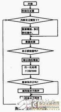 根據(jù)系統(tǒng)功能和硬件實際情況,軟件要實現(xiàn)控制數(shù)據(jù)采集及對采集量進(jìn)行A/D轉(zhuǎn)換、數(shù)字濾波、鍵盤掃描和處理、控制模擬開關(guān)進(jìn)行積分時間和增益的選擇、打印控制、音量控制和數(shù)據(jù)顯示控制等。軟件采用模塊化設(shè)計思路,從整體到局部,從上到下進(jìn)行設(shè)計。主程序流程圖如圖3.1所示。