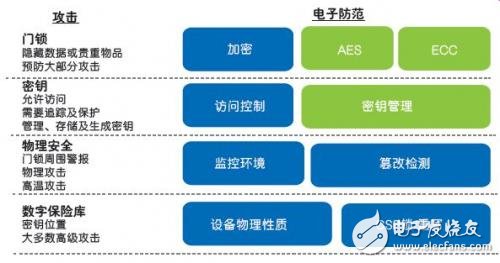 圖3分析了一個完整的安全系統(tǒng)的架構(gòu)。這樣的安全系統(tǒng)考慮了電子系統(tǒng)面臨的所有攻擊途徑。首先是數(shù)據(jù)本身。以銀行類比,數(shù)據(jù)就像保險庫里的錢。保護數(shù)據(jù)的第一步就是要搭建“保險庫大門”,采用加密技術(shù)來隱藏數(shù)據(jù)。這可以保護數(shù)據(jù)免受99%潛在攻擊者的攻擊(缺乏打開“保險庫大門”的工具或動力)。攻擊者的第二種途徑是試圖獲取保險庫的密碼組合(或加密方案的密鑰)。獲得密鑰的一個方法是“暴力破解”,采用高功率處理器不斷猜測密鑰。另一個方法是探測或利用通信線路,試圖“竊聽”密鑰。這通常被稱為“旁路攻擊”。再向下一級是系統(tǒng)自身的物理安全性。在傳統(tǒng)銀行內(nèi),這一層安全保護主要為監(jiān)控攝像頭、溫度及運動傳感器,甚至還包括防止不法分子靠近保險庫的激光系統(tǒng)。這里需要強調(diào)的一點是,每個電子系統(tǒng)都需要這一層安全保護,從而應(yīng)對旁路攻擊,否則就會像酒店門鎖那樣。底層安全代表密鑰安全,即便是安全方案的其他方面都按預(yù)期正常運行。再次以銀行類比,底層安全將涉及到全面了解系統(tǒng)、可能在威脅或惡意情況下自己攻擊系統(tǒng)的管理人員。在電子系統(tǒng)中,底層安全應(yīng)與重要安全數(shù)據(jù)的物理位置相關(guān)。若有充足的時間和昂貴的設(shè)備,某些攻擊可能會破壞和讀取存儲器數(shù)據(jù)。解決這一問題的一個方法是將以上任何一層的安全(通常是物理安全)連接至可擦除重要數(shù)據(jù)(CSP鎖/重寫)的智能邏輯,從而永久防止未來的任何訪問。