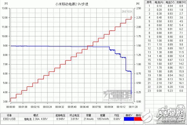 小米移動電源2,9V快充模式電流步進(jìn)測試,起始電壓8.94V結(jié)束電壓6.2V,最大輸出電流為2.2A最大輸出功率16.3W。0.1A~1.8A為正常輸出狀態(tài),1.9A~2.2A進(jìn)入功率限制階段,電流提升電壓會相應(yīng)下降。