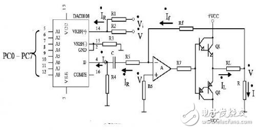 交流量數(shù)模轉(zhuǎn)換電路是可編程漏電電流源的核心部分,正弦交流量振幅的大小是通過改變數(shù)字量來控制,具有良好的線性度。用DAC08 08構(gòu)成數(shù)模轉(zhuǎn)換電路,該器件是二進(jìn)制快速乘法式8位D/A芯片。交流量數(shù)模轉(zhuǎn)換電路如圖2所示。為了保證實(shí)現(xiàn)數(shù)字到正弦交流模擬信號(hào)的轉(zhuǎn)變,圖中VD是預(yù)置直流偏壓,大小等于50Hz正弦波發(fā)生器輸出信號(hào)的幅值。