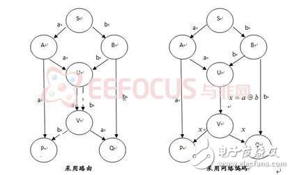 假設(shè)上圖中每條路徑單位時間內(nèi)只能傳輸1比特,則采用路由方式,UV鏈路會成為傳輸瓶頸,即只能傳輸a和b中的一個信息。若UV鏈路傳輸消息b,則信宿P能收到消息a和b,而信宿Q只能收到消息b;若UV鏈路傳輸消息a,則信宿Q能收到消息a和b,而信宿P只能收到消息a。兩者情況下,平均每個信宿節(jié)點的吞吐量為1.5比特。