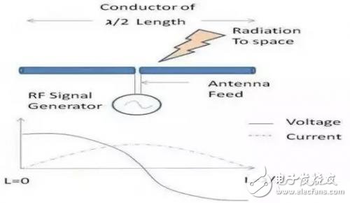 如圖2所示,導(dǎo)體的波長為λ/2,其中λ為電信號的波長。信號發(fā)生器通過一根傳輸線(也稱為天線饋電)在天線的中心點(diǎn)為其供電。按照這個(gè)長度,將在整個(gè)導(dǎo)線上形成電壓和電流駐波,如圖2所示。
