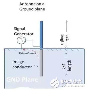 長度為λ/2的天線(如圖2所示)被稱為偶極天線。但在印刷電路板中,大多作為天線使用的導(dǎo)體長度僅為λ/4,但仍具有相同的性能。請參見圖3。