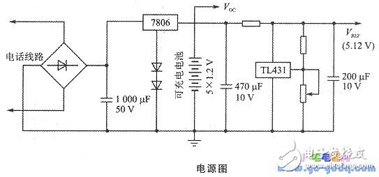 本系統(tǒng)的電源部分如圖3—5所示。取自電話(huà)線(xiàn)上的電源經(jīng)橋式整流、濾波后,由一個(gè)三端穩(wěn)壓器穩(wěn)壓成6.4 V,對(duì)5個(gè)5#可充電電池(每個(gè)1.2 V)進(jìn)行浮充,并作為系統(tǒng)電源。平常系統(tǒng)由電話(huà)線(xiàn)路供電即可正常工作,當(dāng)執(zhí)行收幣及剔除偽幣的動(dòng)作時(shí),高靈敏電磁鐵所需的較大電流(約15 mA)由可充電電池供應(yīng)。另外該6.4 V電壓再經(jīng)一個(gè)精密基準(zhǔn)電壓源TL431穩(wěn)壓到5.12 V,作為A/D轉(zhuǎn)換的參數(shù)電源vREF。PIC16C71的RA口引腳結(jié)構(gòu)方式控制位設(shè)定為PCFGl-0,PCFGO -1。