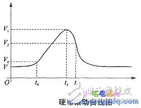 當(dāng)上電復(fù)位時(shí),程序從OOOOH地址開(kāi)始,執(zhí)行一條跳轉(zhuǎn)指令,轉(zhuǎn)至O010H開(kāi)始的主程序。先執(zhí)行初始化,然后由SLEEP指令進(jìn)入“睡眠”微功耗狀態(tài),以減少耗電。當(dāng)硬幣從投幣口投入時(shí),由于遮斷高靈敏微型紅外發(fā)射、接收對(duì)管之間的光通道,產(chǎn)生一個(gè)中斷申請(qǐng)脈沖信號(hào)。其上升沿觸發(fā)了單片機(jī)的RBO (INT)端,把單片機(jī)PIC16C71從“睡眠”中喚醒,進(jìn)入地址為0004H的中斷服務(wù)程序入口。再經(jīng)該處的一條跳轉(zhuǎn)指令,轉(zhuǎn)到檢測(cè)處理材質(zhì)、厚度、直徑三個(gè)傳感器信號(hào)的程序模塊中。材質(zhì)、厚度、直徑三個(gè)傳感器在硬幣滑道上是間隔順序排列的。為了簡(jiǎn)化機(jī)械結(jié)構(gòu)并提高檢測(cè)的速度,可采用對(duì)滾動(dòng)的硬幣進(jìn)行動(dòng)態(tài)檢測(cè)的方法。經(jīng)實(shí)驗(yàn)測(cè)定,材質(zhì)、厚度、直徑三個(gè)傳感器的信號(hào)電壓,在硬幣通過(guò)該傳感器的滾動(dòng)過(guò)程中與時(shí)間的關(guān)系都具有如下圖所示的曲線(xiàn)形狀。